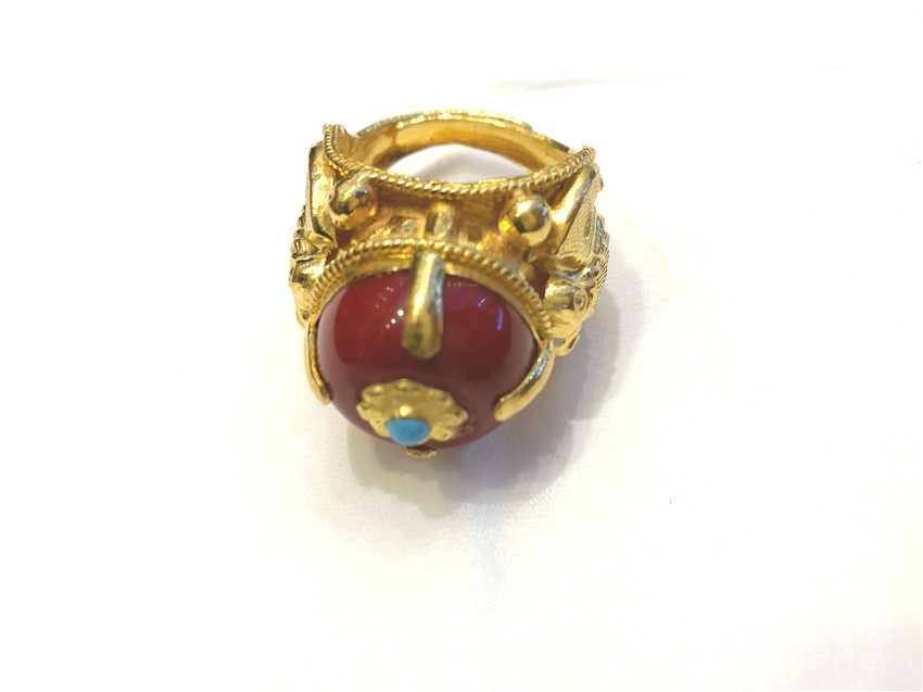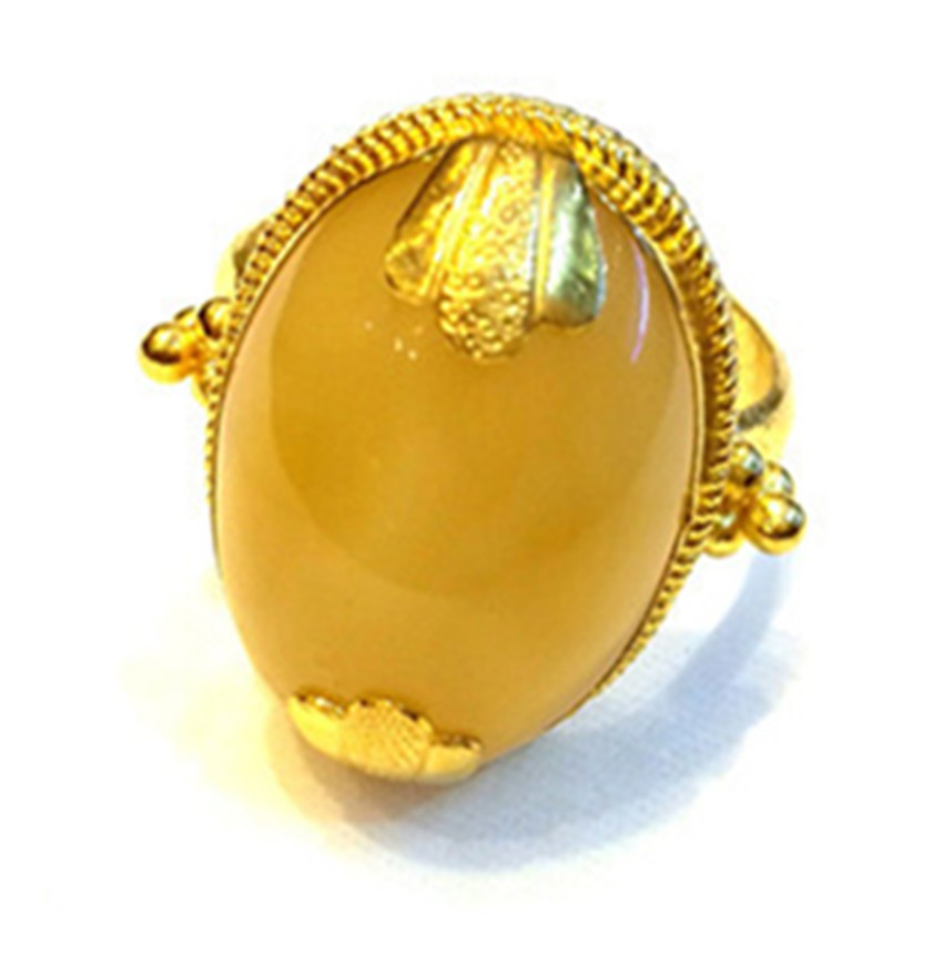 蜜蠟是藏家裝飾中的上成品,藏民族對(duì)蜜蠟的喜愛是非常誠懇的,表達(dá)著他們對(duì)大自然的無限崇敬之情與大自然饋贈(zèng)的感謝之情。在他們看來,蜜蠟除了能夠作裝飾品佩戴、收藏之外,最引人注目的就是靈性修行之功效,設(shè)計(jì)師在此款戒指的設(shè)計(jì)上,緊扣藏民對(duì)蜜蠟的喜愛,并將漢式花邊與蜜蠟結(jié)合,是對(duì)藏漢文化交流較好的體現(xiàn)。