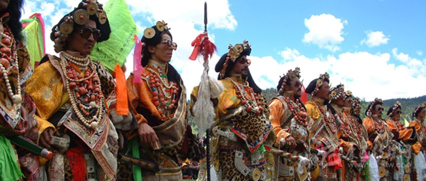 同時,因為康巴藏區(qū)雪峰林立,氣候寒冷。以號稱地球第三極地聞名遐邇??蛋腿嗣袷朗来驮谶@世界屋脊上過著“逐水草而居”的游牧和半牧半農(nóng)的生活。因而在服飾上也形成了具有典型的雪域高原民族獨有的地方風格特色??傮w呈現(xiàn)出寬大粗獷、英武健美、豪氣颯爽的特點和大襟、寬腰、長袖、超長、無扣的特征。而色彩是康巴藏族服飾點綴美的靈魂,他們在色彩運用上十分著重色塊與整體的相襯與和諧,其運用最多的紅、黃、藍、綠、白、黑,往往包含了宗教的象征意蘊,又歸納了雪域大自然所呈現(xiàn)的直觀表征:他們認為藍、白、綠、紅、黃五彩是菩薩的服裝,藍色代表藍天,白色表示白云,綠色表示河流,紅色表示空間護法神,黃色表示大地。這是康巴人貼近自然的感恩之情和神性世界的精神延續(xù)的又一直接表達。
