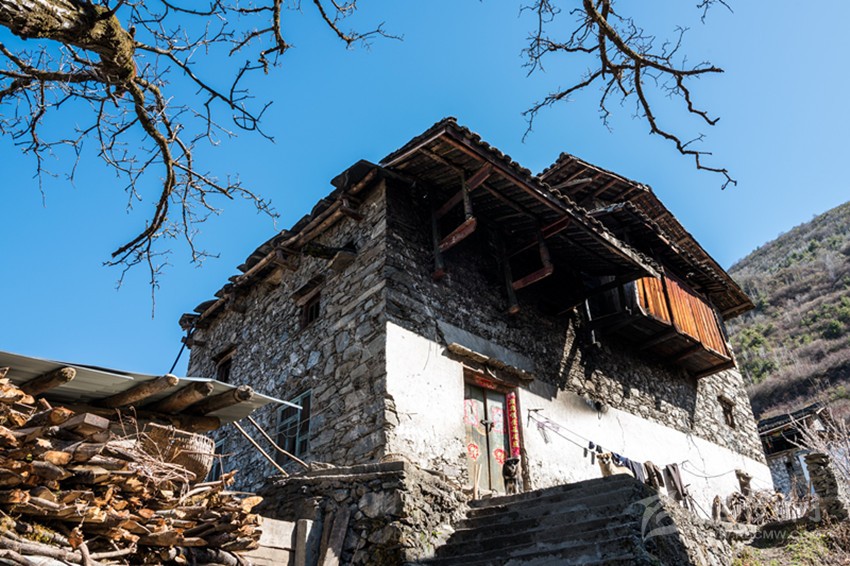 魚通人的房屋符合古人對(duì)居所背山面水的要求,多依山而建。房屋為木石混合結(jié)構(gòu),以片石木材和黃泥為主要材料建成,當(dāng)?shù)厝朔Q之為“碉房”。房屋用石塊壘起,以木頭為墻筋,每隔一定高度,橫砌進(jìn)入石塊,融為一體,使之更為堅(jiān)固牢靠?!暗锓俊?/span> 一般為三層或四層,呈四角或六角形。底層為關(guān)牲畜。第二層為“堂屋”, 在過(guò)去,是集做飯、吃飯、烤火、家人日?;顒?dòng)為一體的場(chǎng)所,地上設(shè)有火塘、灶,并在火塘上設(shè)石制三腳鍋莊或鐵三腳。第三層為各居室,有的設(shè)有貯藏室和會(huì)客屋。頂層為經(jīng)堂,室外為曬壩,作打場(chǎng)、曬場(chǎng)用。有些在外側(cè)設(shè)有一小吊腳樓,可堆放雜物。隨著時(shí)間的流逝,古老的碉房已無(wú)法滿足現(xiàn)在居民的需求,已很少有人居住,而新式碉房在傳統(tǒng)的基礎(chǔ)上開始出現(xiàn)。