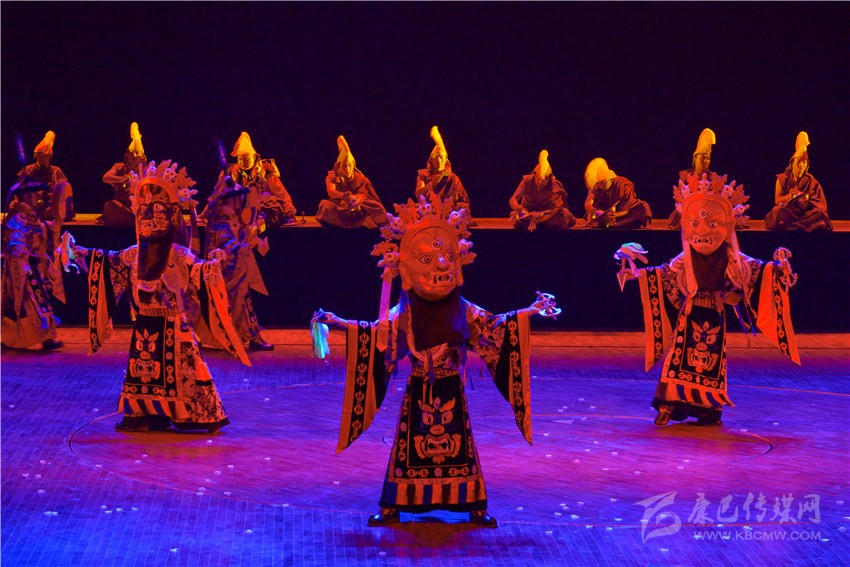 《亞丁?三怙主》歌舞劇不僅從藏族人民日常生產生活中提煉出很多舞蹈文化元素,還對宗教樂舞進行了合理的借鑒。舞劇中用了道孚嘛呢鍋莊、德格卓且、巴塘弦子、爐霍鍋莊、石渠真達鍋莊、丹巴鍋莊、稻城鍋莊等民間舞蹈等元素,加以深化再創(chuàng)作,把原有的民間舞蹈的步伐、舞姿進行夸張性的舞臺處理,并配以適當?shù)年犘?,以更加適應劇場舞臺的表演;大膽創(chuàng)新引入寺廟樂舞,寺廟樂舞本是藏傳佛教寺廟在宗教節(jié)日表演的祈福性舞蹈,舞劇編創(chuàng)人員合理借用寺廟樂舞的音樂、步伐、面具等,用以表現(xiàn)藏族人民與自然抗爭,不懼不屈的精神面貌;用泥土筑墻本是藏族人民建造房屋時的一種建筑技藝,在民間演繹成為地方舞種,舞劇編創(chuàng)人員將筑墻的基本步伐和動作加以提煉,編創(chuàng)了一段約兩分鐘的打舞,用夸張的步伐和動作,配以鏗鏘有力的勞動號子,將豪氣灑脫的打墻舞氣氛推向高潮,以表達藏族人民的勤勞、勇敢與豪邁。州委黨校高級講師陶勇說:“《亞丁?三怙主》歌舞劇旨在講解香格里拉之魂,詮釋亞丁三怙主的本意,闡釋三座神山文化包含佛陀的核心教義。亞丁三怙主即仙乃日(觀世音菩薩)、央邁勇(文殊菩薩)、夏諾多吉(金剛手菩薩),它們分別象征慈悲、智慧、力量。這部歌舞劇是解讀藏民族精神文化、弘揚藏民族真善美勇、傳遞康巴文化真諦的民族歌舞劇。歌舞劇通過《序》、《慈明》、《慧明》、《力明》、《尾聲》五個篇章,充分展示藏族傳統(tǒng)文化中熱情、好客、善良、慈悲、勇敢、追求和諧的優(yōu)秀價值觀,將民族文化融入到社會主義核心價值觀,展現(xiàn)了當代人民群眾的幸福生活。同時對游客來講不僅豐富了亞丁文化,填補了游人僅僅觀賞雪山不知文化內涵的短板,為以后推介甘孜州做了很好的示范?!?/span>