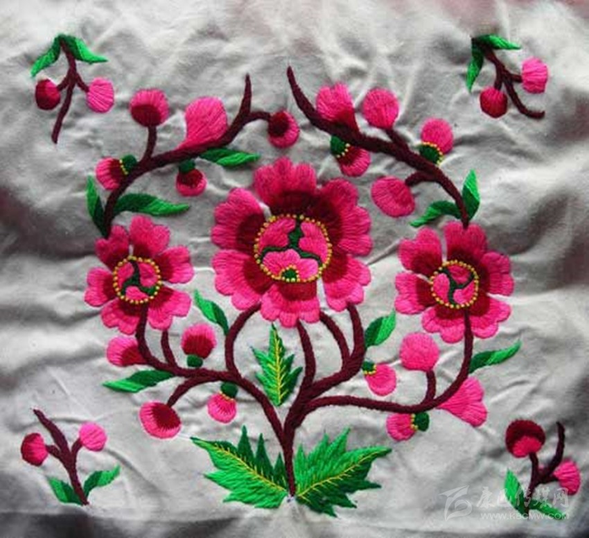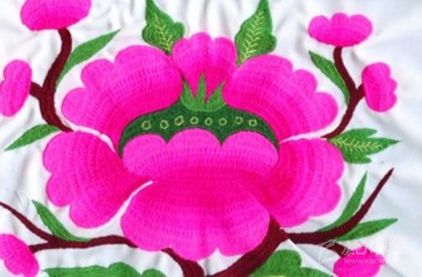 在魚通,刺繡以花朵為主。會繡花的女人,被稱為“花匠”?!靶』ń场眰儚氖鄽q就開始接觸刺繡,通過年長者口傳身授,自學的方式成為一代繡女。稚嫩的雙手,再經過時間的洗禮,刺繡的技巧早已爛熟于心,在心的指引下,穿針引線,針尖如麥芒,各色陪底線來回,穿梭于布料的經緯之間。買回青布,從下手的第一針開始,整幅圖的構架便了然于心,各式花朵圖案成竹在胸,線條在暗自游走,勾勒越來越清晰。每一次的飛針走線,是婦人手上的一針針,一線線,都在為作品最后的完美收關,錦上添花,做著必不可少的鋪墊。