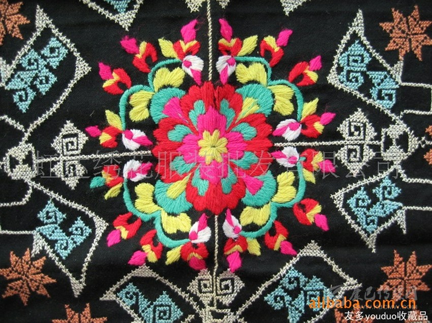 在這里,婦女們猶愛花草。所以,他們的刺繡作品,有生活的細節(jié)滲透,如氣息,若有似無,相互浸潤。無論是花蔓纏枝,還是朵花團簇,都從生活中提煉,視之便信手拈來,放在青布黑衫之上,鮮艷奪目,張顯著生活在這方水土之上,人們獨特的審美情趣。