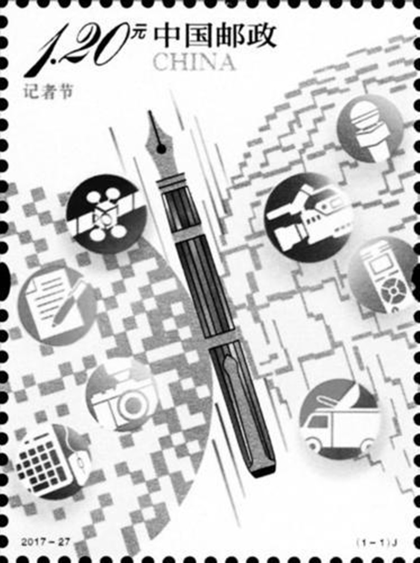 為紀(jì)念第18個(gè)記者節(jié)。中國(guó)郵政定于2017年11月8日發(fā)行《記者節(jié)》紀(jì)念郵票一套1枚。郵票圖案采用了具有現(xiàn)代感的構(gòu)成手法及色彩表達(dá)方式。畫(huà)面中的鋼筆象征了記者秉持弘揚(yáng)民族精神、維護(hù)國(guó)家利益和社會(huì)責(zé)任的專(zhuān)業(yè)精神和自信風(fēng)范。兩側(cè)的線(xiàn)條及方點(diǎn)構(gòu)成的兩個(gè)圓形圖案分別隱喻地球和現(xiàn)代網(wǎng)絡(luò)體系,表示在新媒體時(shí)代,新聞傳播媒介所呈現(xiàn)出的多元化、全球化的發(fā)展態(tài)勢(shì)。畫(huà)面中麥克風(fēng)、攝像機(jī)、錄音筆等形式各異的采編設(shè)備圖標(biāo),結(jié)合衛(wèi)星及地面發(fā)射站等元素,突出了當(dāng)代記者巨大的社會(huì)影響力。同時(shí),鋼筆和兩側(cè)的圓形圖案共同組成了一只振翅飛翔的蝴蝶形象,喻意了記者追求至善至美,在探訪(fǎng)報(bào)道中擔(dān)負(fù)著傳播先進(jìn)文化,引領(lǐng)和維護(hù)和諧社會(huì),推動(dòng)人類(lèi)文明的崇高使命和社會(huì)責(zé)任。