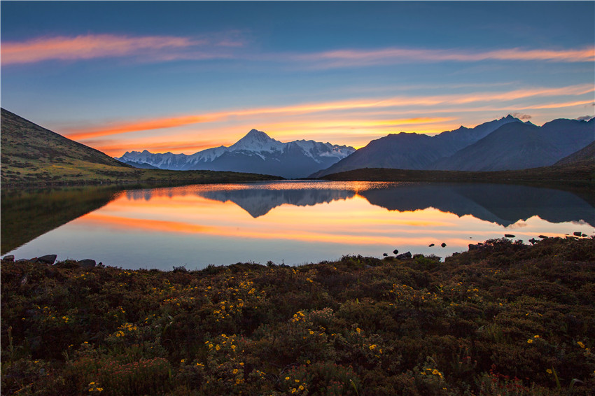 八月的康定本就二十多度,到山上溫度更低一些,加上這里的溪水不比別處的溪流,是雪山融化的水,因此,格外的冰涼。終于到了五色海的邊兒上,整個海子在眼前呈現(xiàn)。此時的五色海對于我們來說,可能不單單是個高山湖泊而已了,在我們抵達五色海之際太陽露出了笑臉,一切都是剛剛好。中午十分撤離五色海回到小木屋,吃過午飯開始下山。