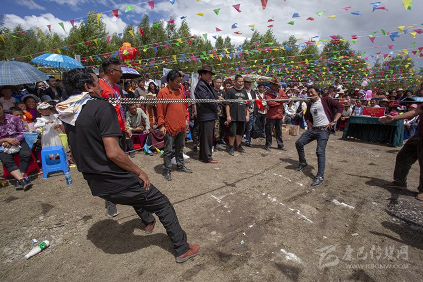 除以上活動(dòng),滾桶接力、俯撐馬鞍吃葡萄、穿藏裝揉糌粑、套牛角等趣味比賽無(wú)不展示民族體育的獨(dú)特風(fēng)格?!斑@種拔河還是第一次見(jiàn),很有意思?!逼渲?,“格吞”比賽(把帶子套在脖子上拔河)深得觀眾喜愛(ài)。