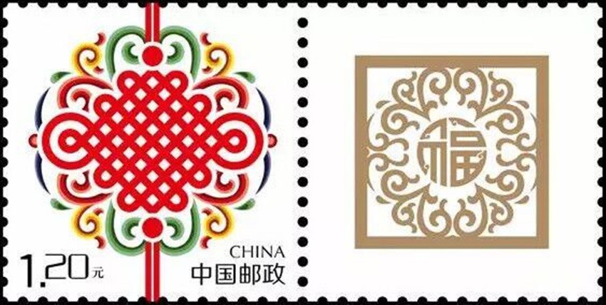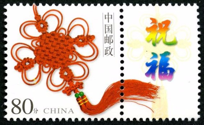 2002年5月10日,中國(guó)郵政發(fā)行《如意》個(gè)性化服務(wù)專(zhuān)用郵票一枚。主票圖案為如意柄端系著一個(gè)紅色“中國(guó)結(jié)”,附票有“祝?!倍?; 2003年3月3日,中國(guó)郵政發(fā)行《同心結(jié)》個(gè)性化服務(wù)專(zhuān)用郵票一枚。主票圖案為盤(pán)長(zhǎng)結(jié)4邊編織有心型繩結(jié)的同心結(jié),附票為“祝?!倍郑?006年9月25日,中國(guó)郵政發(fā)行《中華全國(guó)歸國(guó)華僑聯(lián)合會(huì)成立五十周年》紀(jì)念郵票一枚。圖案為阿拉伯?dāng)?shù)字“5”與中華全國(guó)歸國(guó)華僑聯(lián)合會(huì)圓形會(huì)徽組成數(shù)字“50”,象征全國(guó)僑聯(lián)五十周年,背景畫(huà)面為淡淡的粉紅色“中國(guó)結(jié)”。寓意歸國(guó)華僑與全國(guó)人民血肉相連,同心同德共同建設(shè)美好家園;2013年8月8日,中國(guó)郵政發(fā)行一枚《美好祝?!焚R卡專(zhuān)用郵票,圖案為象征喜慶的紅色“中國(guó)結(jié)”;2014年9月20日,中國(guó)郵政發(fā)行《中國(guó)夢(mèng)(二)——民族振興》特種郵票,其中第四枚“民族團(tuán)結(jié)”,圖案中載歌載舞的各民族群眾上方有一個(gè)大紅的“中國(guó)結(jié)”,象征著各民族大團(tuán)結(jié)。