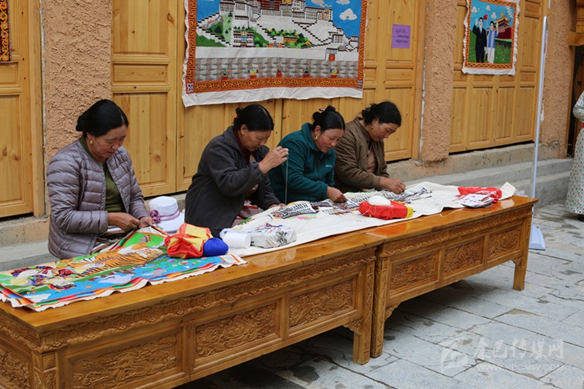 在藏繡展點,5名農牧民婦女正在合繡一幅藏族建筑刺繡作品?!拔覐?6歲開始跟著父親學藏繡,傳到我這已經是第四代了。除了‘六長壽’、度母像等傳統(tǒng)圖案,今年是新中國成立70周年,我還繡了一幅天安門作品?!?7歲的傳承人達打介紹道。