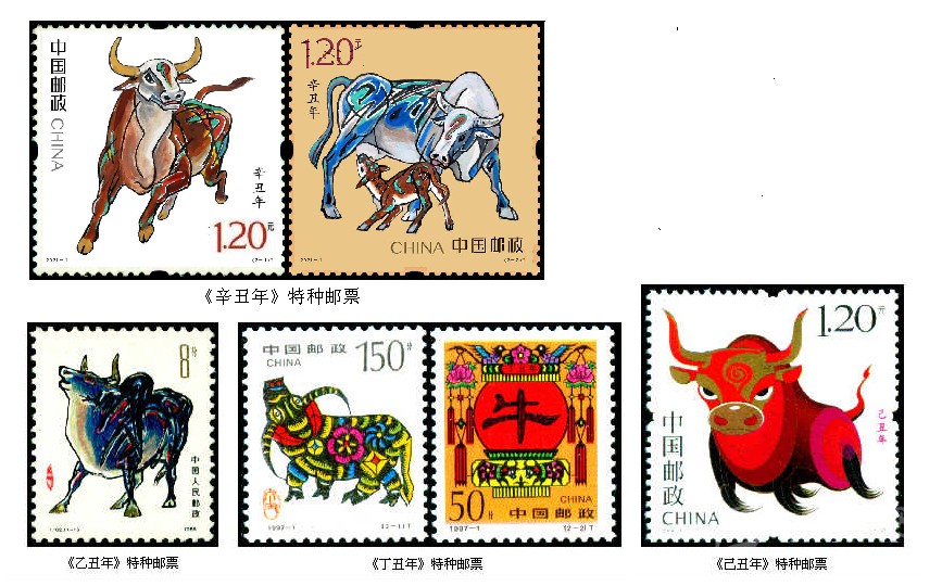 1997年1月5日發(fā)行第二輪生肖郵票中的“牛票”,即《丁丑年》特種郵票,全套2枚。由郵票設(shè)計師呼振源設(shè)計。第一枚“金牛奮蹄”,畫面依據(jù)山東省高密縣方市鄉(xiāng)前曹戈莊村當時33歲的農(nóng)村女子齊秀花的剪紙作品《媳婦騎牛圖》進行設(shè)計,原作中的“媳婦”被刪去,突出了牛的形象,體現(xiàn)出膠東地區(qū)民間剪紙藝術(shù)源于生活、構(gòu)思巧妙、粗獷中多見細膩的本色。只見那彎彎的牛角,垂地的長尾,壯實的牛身,穩(wěn)健的四蹄,都真實地再現(xiàn)了生活中牛的特點,牛身上似花非花,似銅錢又非銅錢的紋飾,充分地表現(xiàn)出樸實的浪漫主義。第二枚“牛耕年豐”,畫面主圖為一只高高掛起的大紅燈籠上,映出了一個醒目的隸書“?!弊郑瑸榕D甑膽c春象征。圍繞著這只燈籠,又進行了幾多創(chuàng)意,兩只喜鵲和一朵梅花,喻意“喜鵲登梅”;旒蘇上的兩朵牡丹,代表幸福、富貴;特別是那春意盎然的“雙牛圖”,畫面雖小,確為點睛之筆,與主圖的大“?!弊志o密呼應(yīng)。
