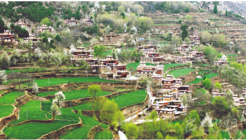 甲居,藏語是“百戶人家”的意思。實際上甲居藏寨分為一村、二村、三村共150余戶人家,700多人口,甲居藏寨所在地形如一個面積為5平方公里的大盆,大盆斜倚卡帕瑪群山,一棟棟外形別致、色彩鮮艷的典型嘉絨藏式民居錯落有致地從山腳一直排到半山。甲居人一代一代修造的梯田點綴民居之間,顯示出別具一格的田園韻味。茂密的柏樹掩映著民居,這些別致的民居不象故宮規(guī)模對稱,也不象蘇州園林隨興布局。碉樓式的民居雖無嚴格的統(tǒng)一規(guī)劃,但卻似乎不是隨意而建,每棟民居都有它獨特搶眼的風格。正是這些別具一格的座座碉樓民居,構成甲居藏寨的精妙絕倫。民居外所立的經幡以及房頂隨風飄動的瑪尼旗,又為恬靜如詩的鄉(xiāng)土民居增添了無限神秘的色彩。祥云籠罩山頂,溪水潺潺環(huán)流,山腳滾滾河流,山水渾映,天水合一,筆者一行不由驚嘆,甲居藏寨 ,名符其實的人間仙境,世外桃源!先前道路險峻留在心底的驚懼早已一掃而光,一行人激動著迫不及待地撲身于美不勝收的仙境之中。