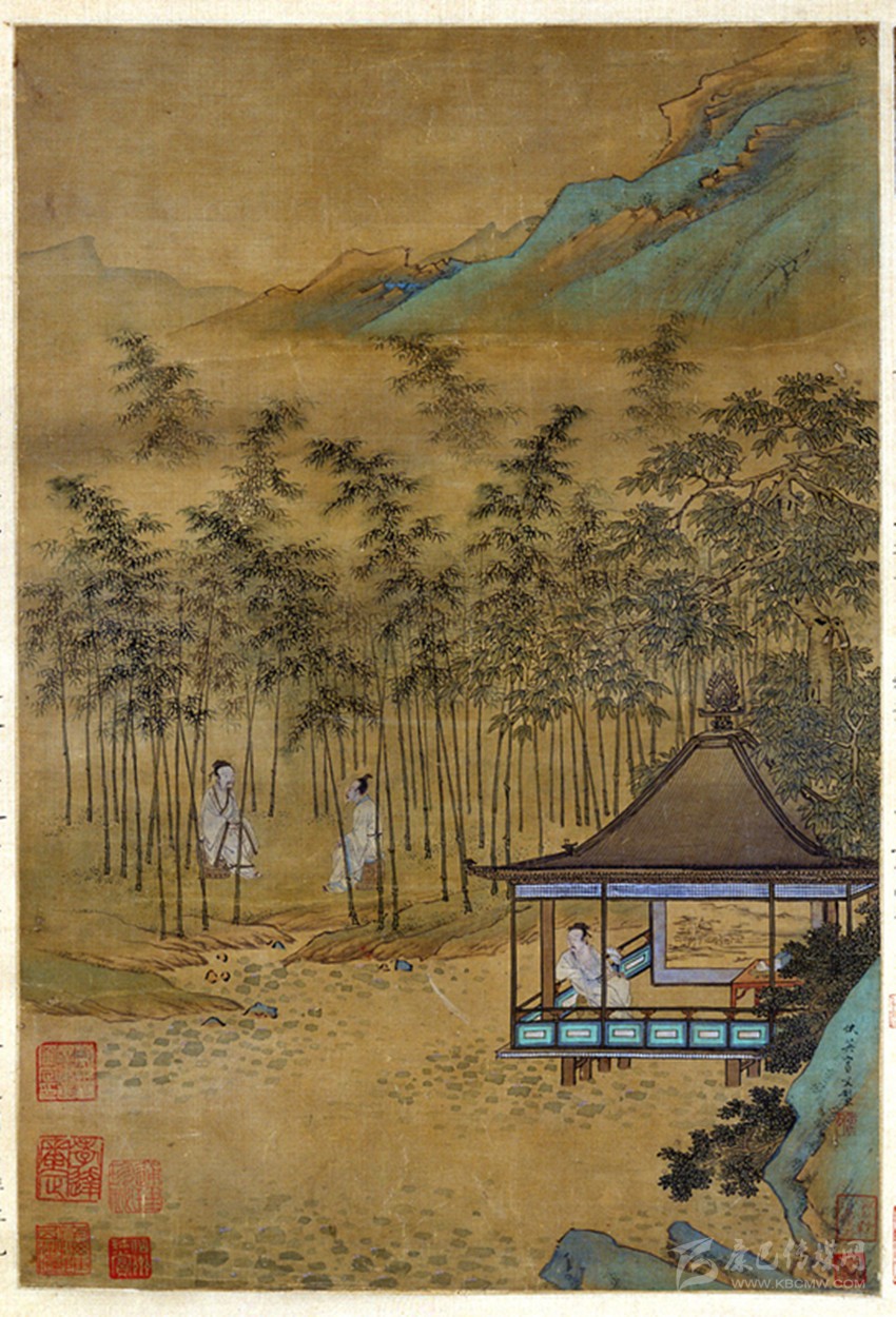 此圖意境極像唐代詩(shī)人王維的藍(lán)田山別墅。這里林木茂密,山澗淙淙,館舍、房屋散布其間,每到夏季,山風(fēng)習(xí)習(xí),涼爽怡人,王維和文友們?cè)诖硕认谋苁?,垂釣飲酒,談?wù)撛?shī)文,修身養(yǎng)性,過(guò)著悠閑自在的隱居生活。他在《竹里館》一詩(shī)里寫過(guò)自己的隱居快樂(lè)感受:“獨(dú)坐幽篁里,彈琴?gòu)?fù)長(zhǎng)嘯。深林人不知,明月來(lái)相照?!比?shī)格調(diào)幽靜閑遠(yuǎn),仿佛詩(shī)人的心境與自然的景致全部融為一體了。宋朝詩(shī)人楊萬(wàn)里喜歡在皎潔的月光之下,清輝孤影,來(lái)到搖曳的竹林中,聽(tīng)著夏夜里悅耳的蟲鳴,夜深氣清,盡管沒(méi)有涼風(fēng)送爽,但是悶熱暑氣頓時(shí)消失,于是他寫了一首《夏夜追涼》詩(shī):“夜熱依然午熱同,開(kāi)門小立月明中。竹深樹密蟲鳴處,時(shí)有微涼不是風(fēng)?!?/span>