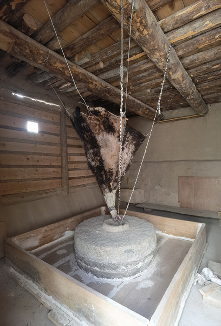 一條約三米寬的水渠橫穿眼前,水渠在側(cè)面依次開了七個口子。上游三個用來排水,冬天用隔板擋著,夏天則用來泄水。中游三個口子都是磨坊的動力來源。走進去是一處水磨坊,三座半徑約0.8米的石磨間隔1.7米一字排開。頂端是牛皮制成的青稞喂料器,由四根繩子系在房間頂角的不同方向;尾端是由牛角制作的喂料嘴,略顯復(fù)雜的繩拉式調(diào)節(jié)器錯綜復(fù)雜,但卻精妙無比地控制著青稞的出料速度。