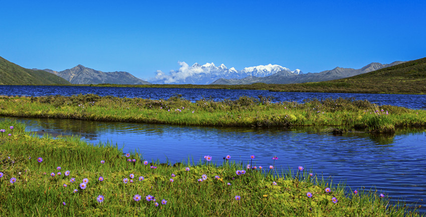 在山谷中穿行十余公里,路面一點(diǎn)點(diǎn)抬起,上了貢嘎山脈,徑直進(jìn)入康定情歌景區(qū)。隨著海拔的升高,涼意漸濃。山依舊是主角,地勢(shì)卻變得平緩而開闊,有茵茵的草地,有大小湖泊,沿途山泉潺潺,野花點(diǎn)綴,空氣清幽,方才單調(diào)的褐色很快被淡忘。山體漸次出現(xiàn)密集而低矮的灌木,枝條筆直地立著,有高寒山區(qū)的凜然之氣。灌木一層層上延,樹木雜多,大片的原始森林漫過山體,將大山包裹起來。遠(yuǎn)處,藍(lán)天白云之下,貢嘎雪山在群峰中探出頭來,擦亮高空的陽光。澄明的空氣里,仿佛可以聽見雪粒咯咯地笑。剎那間,仿佛所有的大山,都開始舒展筋骨。
