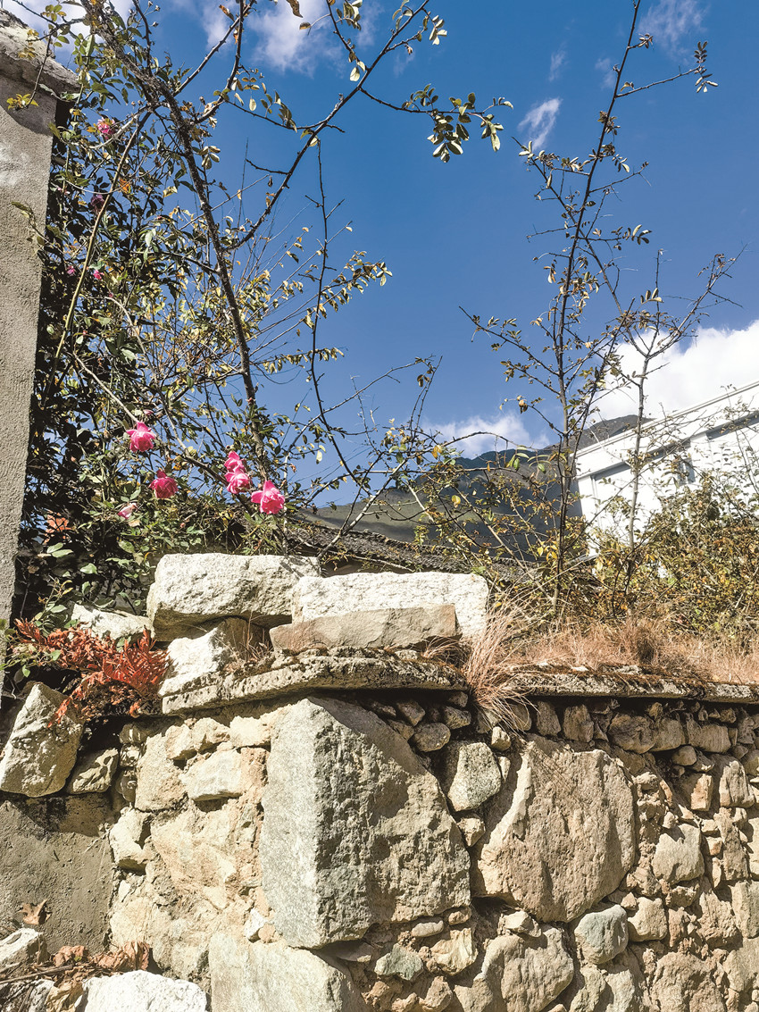在小飯館里簡單吃了一頓午餐,可惜沒有嵐安豆花,臘肉倒是如大家說的那樣香。吃完飯?jiān)诖遄永锫o目的的轉(zhuǎn)悠,石頭砌的矮墻將每家每戶的房屋圍成院子,墻頭上的草已經(jīng)泛黃枯萎,偶爾有幾枝玫紅色的月季從墻頭伸出來,給石墻點(diǎn)綴了一些色彩和生機(jī)。石墻與石墻之間,是串聯(lián)起每一戶人家的村間小道,經(jīng)過幾戶農(nóng)家,腳下硬化的路面斷了,往前延伸的是窄小的泥路,路兩旁有綠油油的菜地,有收割完的玉米地,有一排排的蘋果樹……往更遠(yuǎn)的地方看去,田地盡頭的山坡上是紅軍紀(jì)念碑,原來這里可以通往紀(jì)念碑,不過目測距離有點(diǎn)遠(yuǎn),收住腳步往回走,沿著村道朝另外一個方向走走看。前面是散落在小山坡上的幾戶人家,比起之前被石墻圍起看不見樣貌的農(nóng)家,山坡上的這些房子錯落有致,清楚的看得見院子的全貌,房屋大多是一層的由石墻瓦頂構(gòu)筑的,每一戶人家都飄揚(yáng)著鮮艷的紅旗。