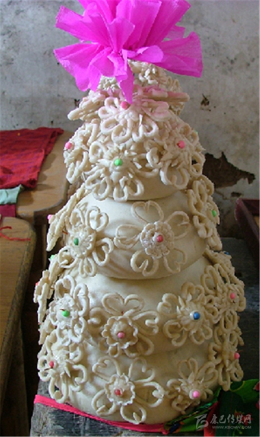 何謂“花饃饃”,顧名思義,就是用面粉做成的一種夾心并模印圖案的薄餅。一般“花饃饃”的厚度約一指厚,直徑為13厘米左右。制作“花饃饃”時,一定要用新打出的本地面粉(用新面意為喜慶豐收)并不加發(fā)酵的老面(主要防止饃饃以及饃饃上的圖案變形),只加少許蘇打以水揉面即可。餡兒是由藏族特有的食品酥油、糌粑、奶渣等拌上紅糖或白糖而成。先將揉好的面粉揉成巴掌大的面坨,把調好的心子包在面坨內,然后壓平,盡量使它變成圓形,并在“花饃饃”的最中心粘一小片青綠的蘿卜葉,然后用雕有各種圖案的印板印上圖案。印板圖案多為三條圓圈或藏族美術中常有的萬吉祥等,圈內雕有玉兔、鹿子、獐子吉祥物等,一般是一對玉兔相對而立,或是鹿子休閑躺于青草之上,或是兩朵鮮花對開,或是……再用手將“花饃饃”的周邊勒成各種花邊,并點上幾點食用紅點(紅點表喜慶,如年內曾遇喪事則不點紅點)。最后將成形的“花饃饃”置于平鍋底在火上烘成即可。烘好后的“花饃饃”外形呈圓形,象征圓月,“圓月”里有玉兔等吉祥圖,有象征喜慶吉祥的紅,有象征春天的綠,極為鮮麗好看而又香甜味美,叫人垂涎。但做好后不能立即實用,首先要選兩個最大最好的來敬月亮,敬菩薩,要等敬月亮,敬菩薩后,中秋這天才能吃,并伴以水果等物贈送鄰里、親朋。據說這是為了促進友誼,讓大家品嘗共享吉祥。