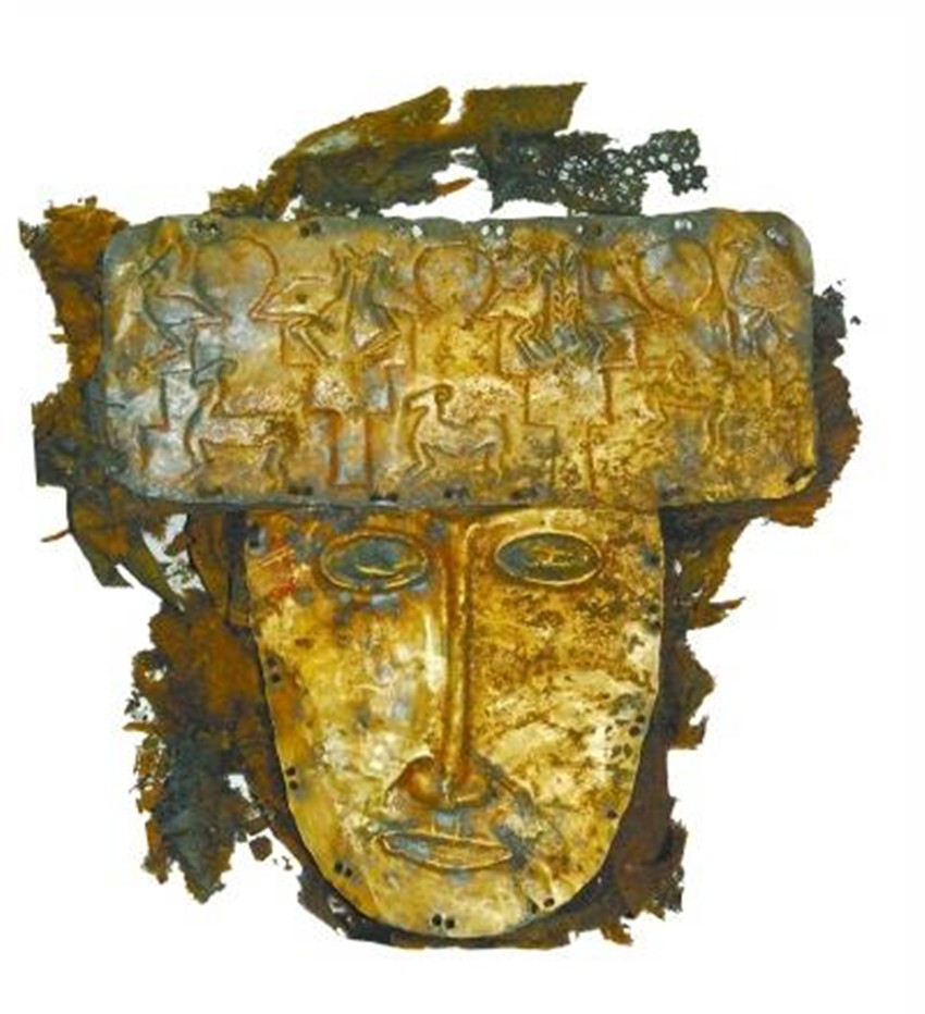 這是西藏天葬的早期形式?或是為了能夠更長久地保存而剔除軟組織,留下堅硬的尸骨?雖然我們對于這一葬俗的深層原因還不得而知,但可以推測,黃金面具最基本的功能可能是用以在尸骨最終埋入墓室時進行面部裝飾。用朱紅色的顏料涂在面具的五官輪廓上,可以創(chuàng)造出活生生的人的形象,用金燦燦的貴重金屬襯上金燦燦的絲綢覆面,打造出王者風(fēng)范,既可以維護死者最后的尊嚴(yán),也體現(xiàn)了他所擁有的財富和社會地位。