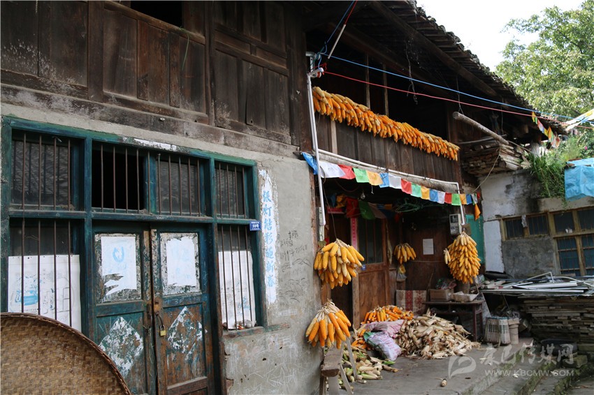 “這算是原生態(tài)的土司房了”,穿過小道,董老指著一間木板房;“是的,不過它的危險系數(shù)很高?!庇嗳A應(yīng)道。近看,門窗屋檐做工精細,散發(fā)著古樸感,但也不難發(fā)現(xiàn)屋身的“補丁”;后退兩步觀望,整個屋身稍傾斜,是典型的危房。繼續(xù)行走,是泥土和木板結(jié)構(gòu)的房屋,這也是上衙門遺址最后一站。據(jù)董老講述,這里是土司老爺審人的地方,犯人就跪在門坎的大石階上。不過,金黃玉米與鋼筋門窗的出現(xiàn),很難讓人想象土司老爺在該地審案的景象。