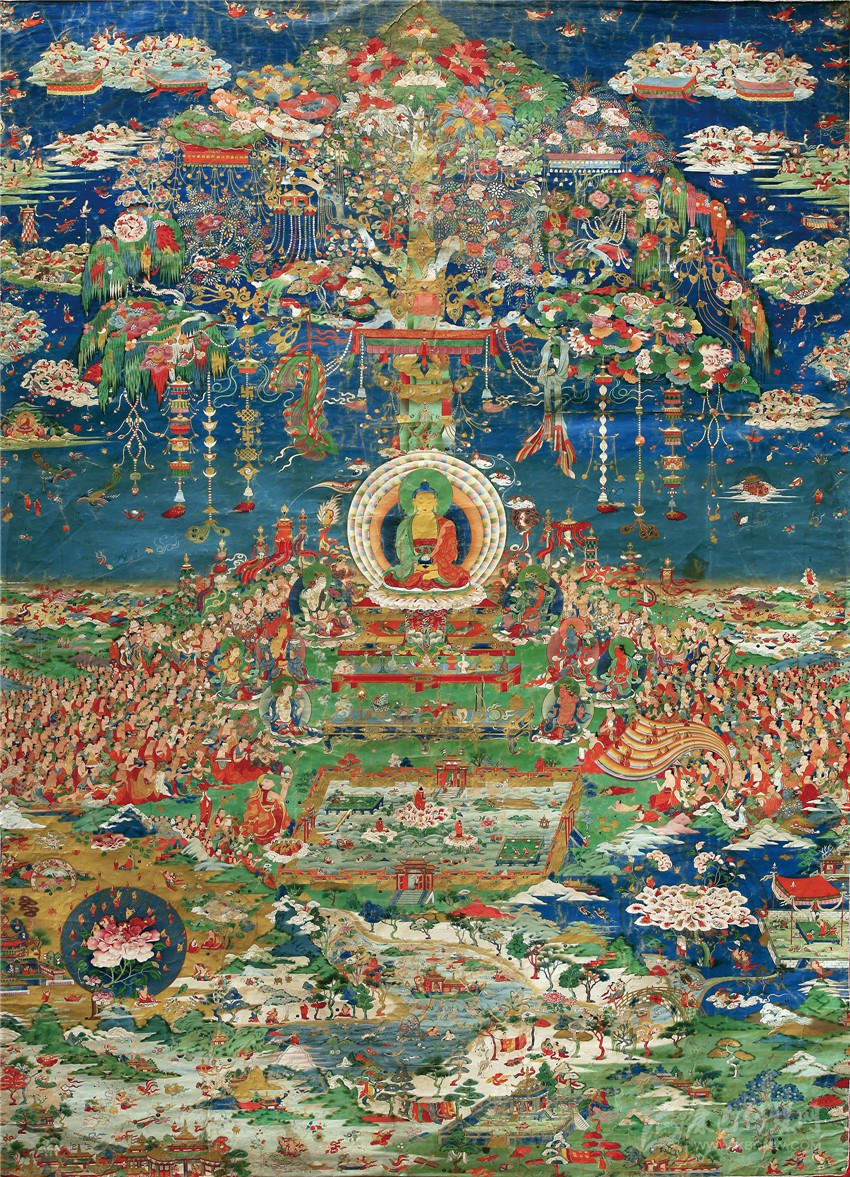 具有超越凡人的精微刻畫(huà)能力,也使得郎卡杰在面對(duì)畫(huà)布時(shí),有更廣大的空間來(lái)展示他的繪畫(huà)天賦。從存世的作品《無(wú)量光佛凈土》中,看得出郎卡杰喜歡將自己的“毫毛畫(huà)師”的能力發(fā)揮到極致。不管是花紋、瓔珞、還是人物,但凡是畫(huà)面上出現(xiàn)的物象,他都會(huì)以精致、繁密的形式出現(xiàn)。所以他的畫(huà)面世界里往往都是人山人海、琳瑯滿目;盈寸之間,容納萬(wàn)千;場(chǎng)面浩瀚、氣勢(shì)恢宏、不可思議!