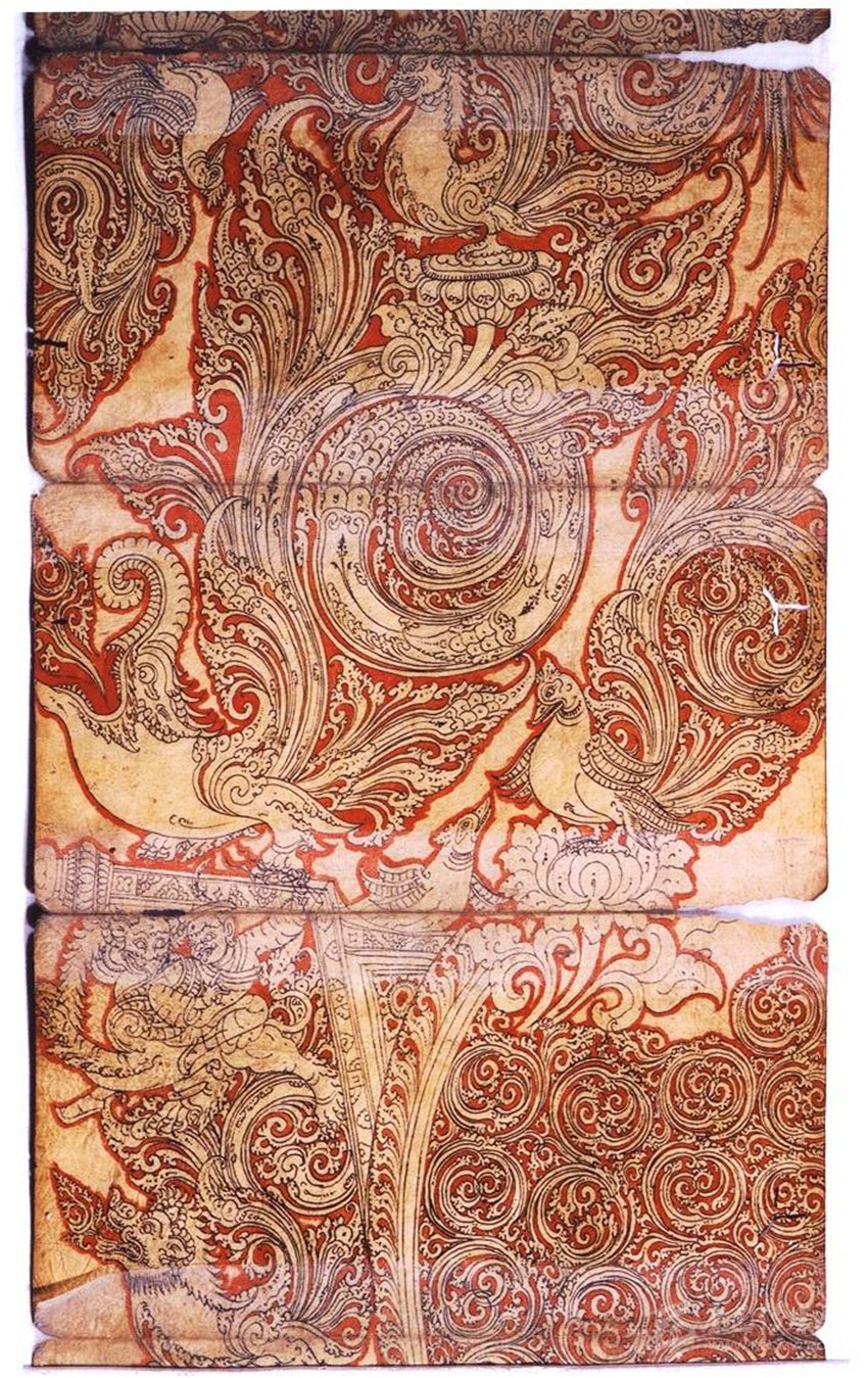 (二)裝飾圖案化:藝術(shù)中的“希臘化”過程,蔓延到南亞地區(qū),已是“強(qiáng)弩之末”。故南亞美術(shù)受到希臘藝術(shù)的影響,但是并不徹底。所以在表現(xiàn)物象體積和空間的時(shí)候,顯得力不從心,往往是想寫實(shí)的物象表現(xiàn)成裝飾性的圖案,時(shí)間一長,便演變成為南亞的審美傳統(tǒng)。比如各種動(dòng)物和植物紋樣,以及卷草紋、連珠紋等。尼瓦爾唐卡中的人物、動(dòng)物、植物和事物大多通過精美的、圓弧組成的各種裝飾圖案來表現(xiàn)。