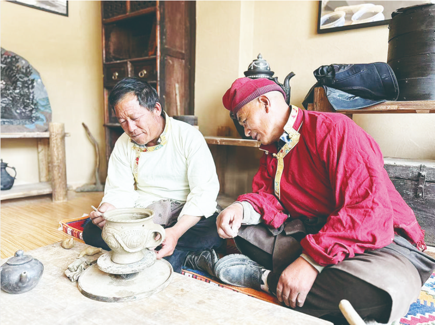密林掩映、群山環(huán)峙的白玉縣河坡鎮(zhèn),藏族金屬鍛造技藝傳習所內(nèi)叮當之聲不絕。非遺傳承人呷絨降措正在打造一件精美的金屬飾品,繁復的花紋和金光閃閃的色澤令飾品價值不菲。