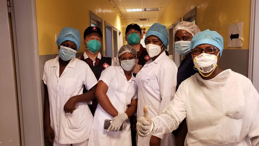 ??2020年5月26日,中國抗疫醫(yī)療專家組在剛果(布)首都布拉柴維爾指導(dǎo)新冠肺炎病房建設(shè)時,與當(dāng)?shù)匾痪€醫(yī)務(wù)人員合影。新華社發(fā)