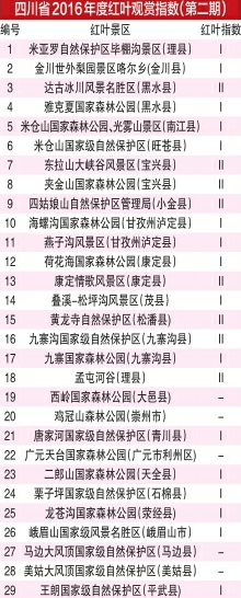 整個(gè)紅葉觀(guān)賞季期間,由省林業(yè)廳、省旅游局指導(dǎo),省生態(tài)旅游協(xié)會(huì)監(jiān)測(cè)的紅葉觀(guān)賞指數(shù)將持續(xù)發(fā)布。每周四,華西都市報(bào)將每周發(fā)布一期“紅葉指數(shù)”。在10月19日四川省林業(yè)廳發(fā)布的第二期紅葉觀(guān)賞指數(shù)中可以看到,理縣孟屯河谷、達(dá)古冰川、四姑娘山、九寨黃龍等9個(gè)點(diǎn)位都達(dá)到Ⅱ級(jí)紅葉觀(guān)賞指數(shù)。較之上周,更多點(diǎn)位的葉子開(kāi)始進(jìn)入適宜觀(guān)賞期。紅葉巔峰期近在眼前。