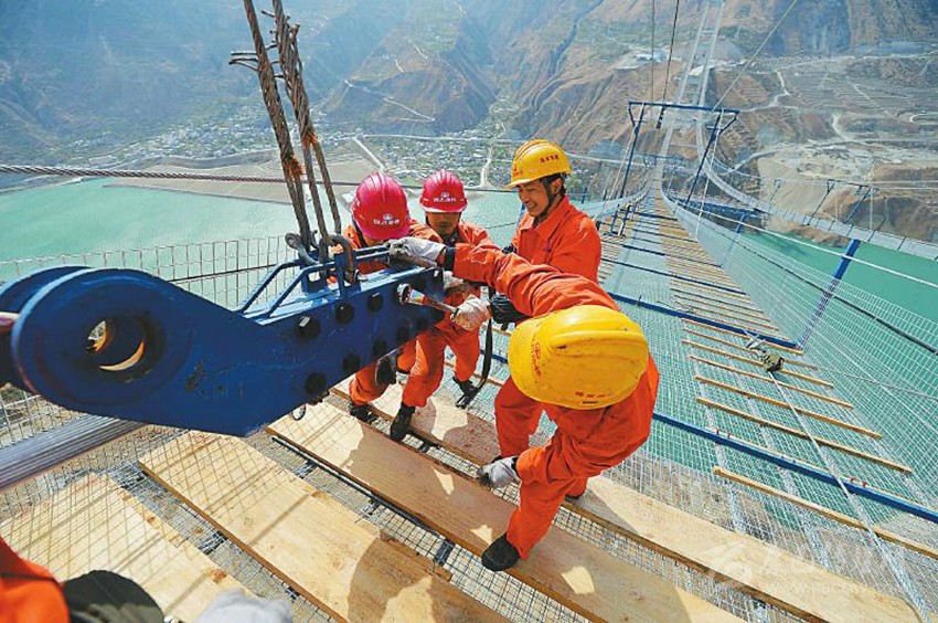 經(jīng)過2小時(shí)的牽引施工,4月5日,雅康高速公路重點(diǎn)控制性工程、被稱為“川藏第一橋”的瀘定大渡河興康特大橋首根主纜索股成功架設(shè),跨越大渡河“鎖定”在康定、雅安境內(nèi)的錨碇上。特大橋上部構(gòu)架主體工程施工由此正式啟動(dòng),甘孜藏區(qū)迎來(lái)首條高速大通道指日可待。
