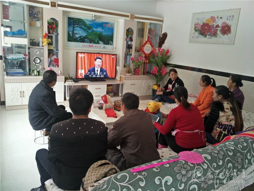 金剛村所有黨員和支部共建共創(chuàng)單位的干部職工,康定市群工局工作人員一同聚在了村支部書記毛芝榮家中收看黨的十九大開幕會。