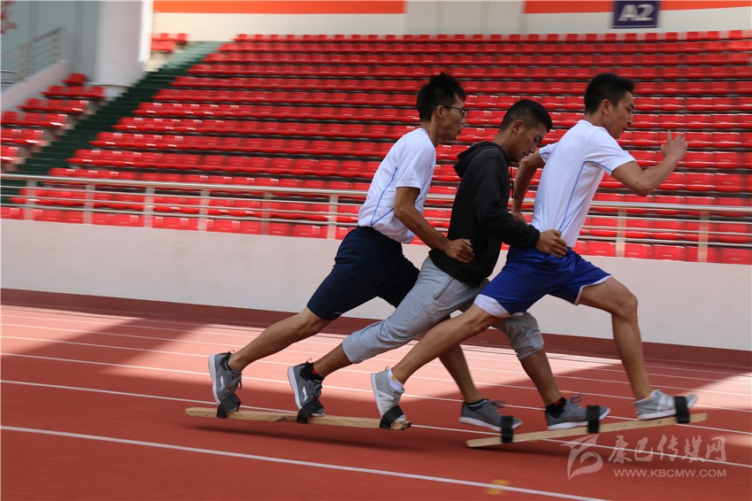 “啪,啪,啪……”,在高腳競速訓(xùn)練場地的對(duì)面,板拍打地面的聲音有節(jié)奏地在賽道上回蕩著。記者看到4組板鞋競速隊(duì)正在有序訓(xùn)練,每隊(duì)有三名運(yùn)動(dòng)員,他們都把腳套在一個(gè)木板鞋上,后面的兩個(gè)運(yùn)動(dòng)員把手放在前一個(gè)運(yùn)動(dòng)員的腰上,三個(gè)人齊心協(xié)力,喊著有節(jié)奏的口號(hào),彼此邁著統(tǒng)一的步伐為了共同的目標(biāo)而前進(jìn)。每一組的隊(duì)員都是齊心協(xié)力,好像他們已然融為一體,步伐的頻率和擺臂的頻率都是一致的,絲毫沒有違和感。