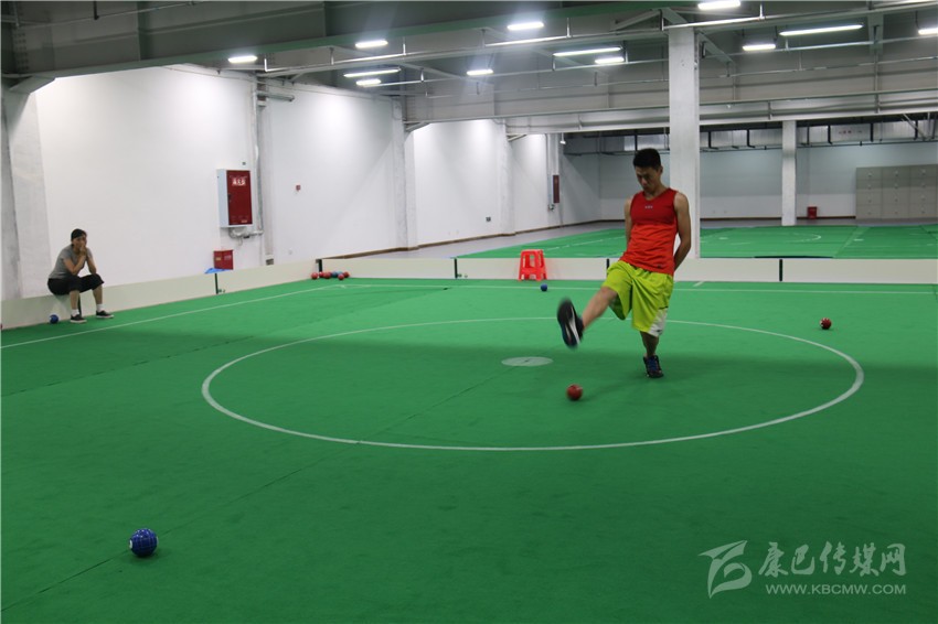 記者隨后被工作人員帶到了蹴球訓(xùn)練場地,只見在一個(gè)10米×10米的正方形平地上,一個(gè)運(yùn)動(dòng)員腳跟著地,用腳掌擠壓球,去擊中場內(nèi)球。