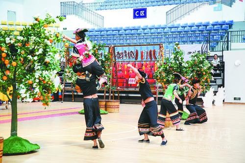 雅安市代表團(tuán)教練李鏡文告訴記者,《石炯諧博》表演項(xiàng)目依托當(dāng)?shù)匾图颐袼?,在黃果柑豐收的季節(jié),石棉縣彝族小伙、姑娘們在果林里采摘黃果柑時(shí)所產(chǎn)生的勞動(dòng)趣味競技活動(dòng)的演繹,反映了少數(shù)民族地區(qū)經(jīng)濟(jì)發(fā)展、社會繁榮穩(wěn)定、各族人民安居樂業(yè)的生活和精神風(fēng)貌。