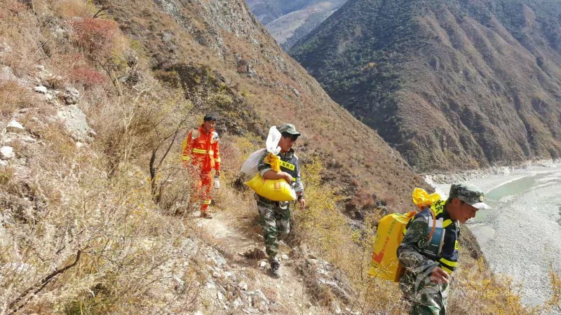 車(chē)輛無(wú)法前行,白玉縣民兵以及相關(guān)應(yīng)急隊(duì)伍將救災(zāi)物資順著小路背上現(xiàn)場(chǎng)