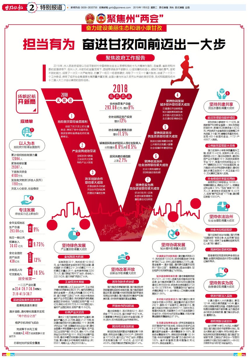 2019年預期全州地區(qū)生產(chǎn)總值增長8%左右,工業(yè)增加值增長9%左右,全社會固定資產(chǎn)投資增長8%左右,社會消費品零售總額增長12%左右,地方一般公共預算收入增長9%左右,城鎮(zhèn)居民人均可支配收入增長8.5%左右,農(nóng)村居民人均可支配收入增長10.5%左右,全州5個貧困縣將“摘帽”……