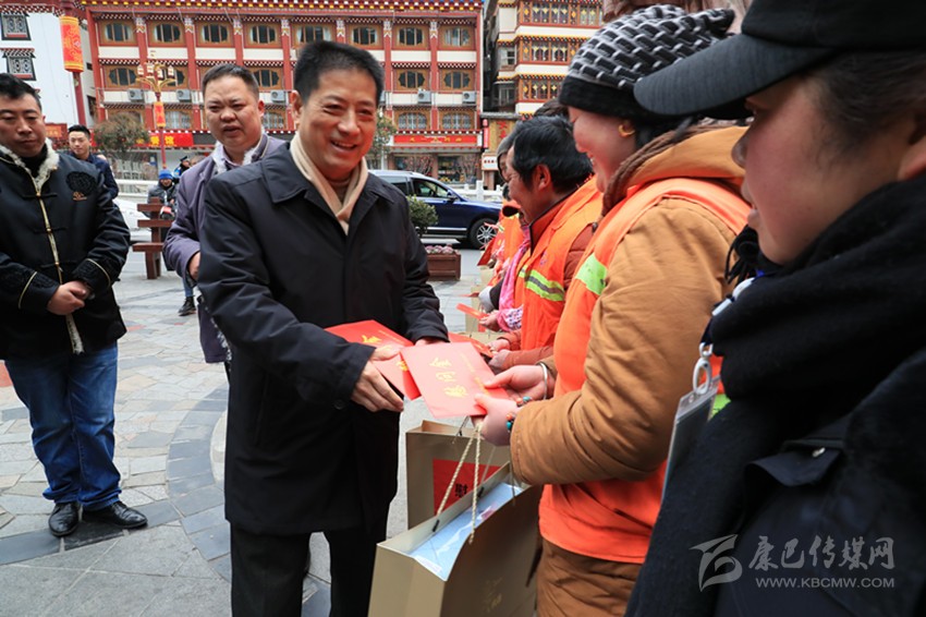 “你們每月工資多少?都按時(shí)領(lǐng)到了嗎?還有什么困難嗎?……”,慰問中劉成鳴非常關(guān)心環(huán)衛(wèi)工人的生產(chǎn)生活情況,與大家一一握手問好。劉成鳴代表州“四套班子”向奮戰(zhàn)在環(huán)衛(wèi)戰(zhàn)線的全體干部職工致以崇高敬意和新春?jiǎn)柡?,?duì)堅(jiān)守崗位的環(huán)衛(wèi)工人付出的辛勤勞動(dòng)表示衷心感謝。他說(shuō),環(huán)衛(wèi)工人是城市的“美容師”,情歌之城康定近年來(lái)城市面貌不斷提升、城市環(huán)境不斷改善,這是我們環(huán)衛(wèi)工人辛勤勞動(dòng)和無(wú)私奉獻(xiàn)的結(jié)果。他說(shuō),隨著雅康高速的貫通,越來(lái)越多的游客會(huì)走進(jìn)甘孜來(lái)到康定,希望大家在新的一年里,再接再厲,繼續(xù)發(fā)揚(yáng)無(wú)私奉獻(xiàn)精神,立足本職,愛崗敬業(yè),把康定打扮得更加靚麗,為城市形象提升和全域旅游發(fā)展做出更大貢獻(xiàn)。他要求,相關(guān)部門要進(jìn)一步關(guān)心關(guān)愛環(huán)衛(wèi)工人,解決好他們工作和生活中的實(shí)際困難。
