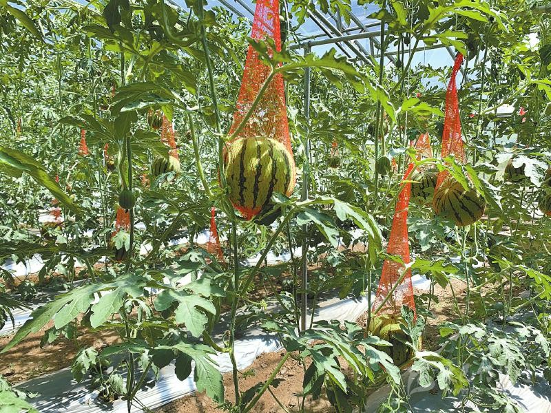 旭日鄉(xiāng)現(xiàn)代農(nóng)業(yè)示范基地的西瓜大棚里果實(shí)累累。