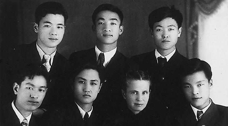 1949 年 6月1日,李鵬同志(后排左)在蘇聯(lián)伊萬諾沃動力學(xué)院補(bǔ)習(xí)數(shù)理化及俄文時(shí)與俄語教師費(fèi)德洛娃(前排左三)及同學(xué)合影。 新華社發(fā)