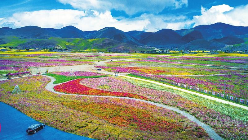 2018年9月,距甘孜州稻城縣城7公里的色拉鄉(xiāng)八美村山谷,1500余畝格桑花開成壯美“花?!?。而這里以前曾經(jīng)是沙化嚴(yán)重的低效益牧場。