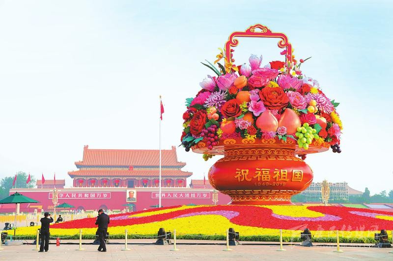 記者從北京市園林綠化局獲悉,今年的天安門廣場主體花壇延續(xù)了群眾喜聞樂見的“花果籃”造型,以紅色和黃色為主色調(diào),花壇頂高18米,籃體高16米,籃盤直徑12米,花壇底部直徑45米?;@體南側(cè)書寫 “祝福祖國,1949-2019”字樣,籃體北側(cè)書寫“普天同慶,1949-2019”字樣。