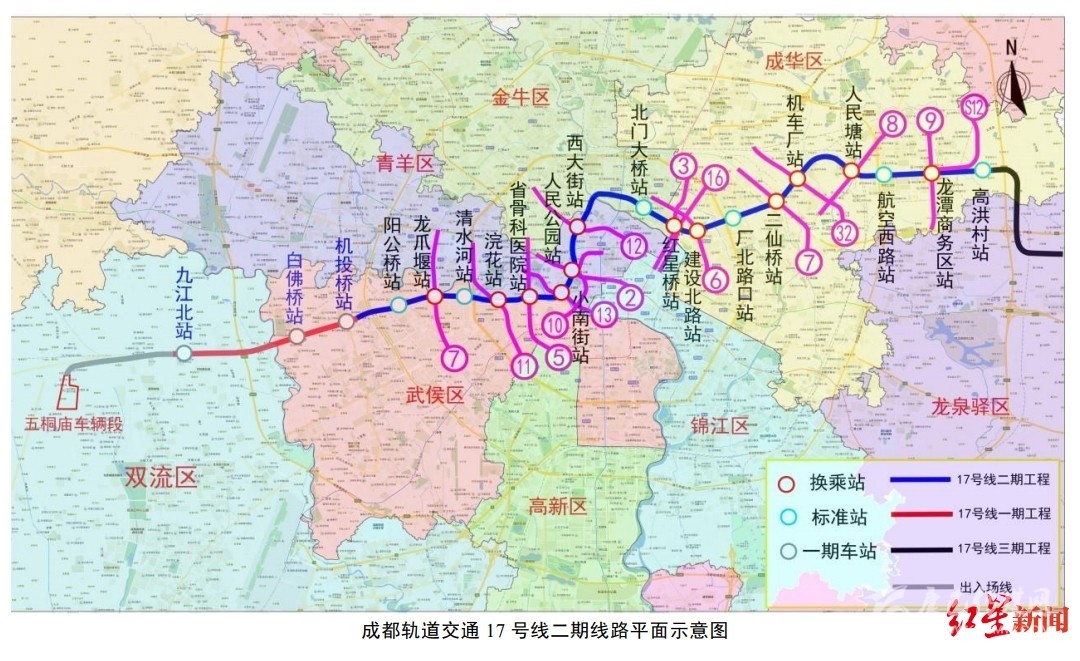 紅星新聞?dòng)浾吡私獾剑?7號(hào)線一期工程已于2017年1月開工建設(shè),計(jì)劃于2020年12月底建成投入試運(yùn)營(yíng)。本次環(huán)評(píng)公示的17號(hào)線二期工程位于成都市雙流區(qū)、武侯區(qū)、青羊區(qū)、金牛區(qū)和成華區(qū),工程起于一期工程機(jī)投橋站(不含),止于高洪片區(qū)的高洪村站(含),線路自西向東沿永康路-晉陽路-龍騰東路-大石西路-小南街-北較場(chǎng)西路-成華街-張家巷-建設(shè)北路-二仙橋北路-航天路敷設(shè)。線路長(zhǎng)約24.8km,均為地下線路,共設(shè)置地下車站18座,其中有換乘站12座。
