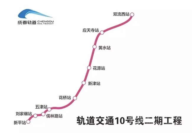 10號線二期起于一期雙流機場2航站樓站,串聯(lián)了雙流機場、雙流西客運樞紐至新津主城區(qū),止于新津縣新平鎮(zhèn),線路全長27.06km,高架段及過渡段設(shè)車站10座,其中地下站5座,高架站5座。