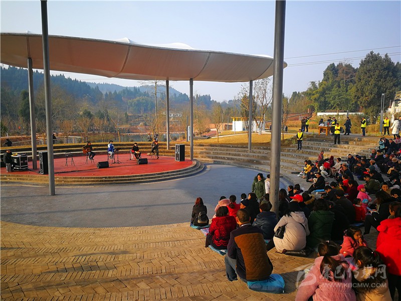 “遠(yuǎn)處的東山俯望著平靜的旌湖水,它流淌著,帶走了年輕的歲月……這就是我的家德陽,遠(yuǎn)方的人回來吧!”1月19日上午,在旌陽區(qū)東湖街道高槐村里傳來動(dòng)聽的民謠。遠(yuǎn)遠(yuǎn)看去,村民們圍坐在“田野秀場(chǎng)”正聽著樂隊(duì)歌唱,不時(shí)還跟著音樂打著拍子。