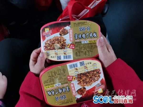 18日中午12時(shí), 列車(chē)出發(fā)2小時(shí)后,巴中恩陽(yáng)人鄔兵領(lǐng)到了來(lái)自家鄉(xiāng)的午餐——一盒自熱米飯,配菜是宮保雞丁?!安诲e(cuò)不錯(cuò),今年不用吃方便面了?!倍松厦罪埖泥w兵笑了笑。