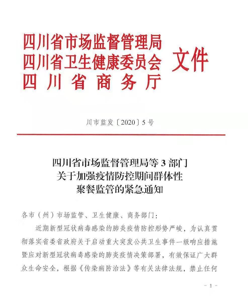 四川新聞網(wǎng)成都1月25日訊(記者 李丹)1月25日,四川省市場監(jiān)督管理局、四川省衛(wèi)生健康委員會、四川省商務(wù)廳3部門聯(lián)合發(fā)布緊急通知,近期新型冠狀病毒感染的肺炎疫情防控形勢嚴(yán)峻,為認(rèn)真貫徹落實(shí)省委省政府關(guān)于啟動重大突發(fā)公共衛(wèi)生事件一級響應(yīng)措施暨應(yīng)對新型冠狀病毒感染的肺炎疫情決策部署,有效保證廣大群眾生命安全,根據(jù)《傳染病防治法》等有關(guān)法律法規(guī),禁止任何餐飲單位和個(gè)人舉辦任何形式的群體性聚餐活動,已經(jīng)訂餐的應(yīng)盡快取消或延期舉辦。