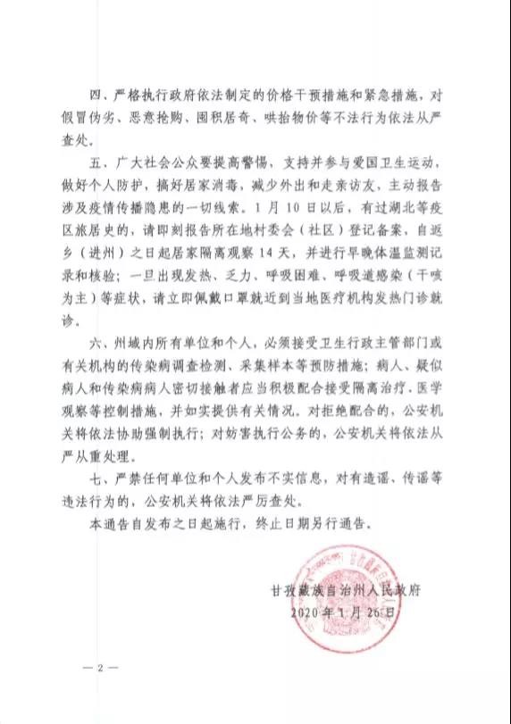 1月27日,按照《新型冠狀病毒感染的肺炎診療方案》規(guī)定,根據(jù)病例臨床表現(xiàn),結合流行病學史、實驗室檢測結果,經(jīng)甘孜州新型冠狀病毒感染的肺炎病例確認專家組評估確認此1例病例為輸入性新型冠狀病毒感染的肺炎病例。截止1月27日24時,我州累計報告新型冠狀病毒感染的肺炎確診病例3例。在治重癥1例,其余患者病情穩(wěn)定,均在定點醫(yī)院接受治療。正在接受醫(yī)學觀察29人。目前我州已發(fā)現(xiàn)新型冠狀病毒感染的肺炎患者,均為輸入性病例,無本地發(fā)病病例。全州上下正在全力以赴開展疫情防控工作,請大家正確認識、科學防控、不必擔心和恐慌。希望大家:1、不信謠、不傳謠,少外出、勤洗手、常通風,注重口罩文明和咳嗽文明。2、請大家配合各項疫情防控工作,如果發(fā)現(xiàn)異常車輛和人員,主動向當?shù)匦l(wèi)健局或疾控中心報告。3、出現(xiàn)發(fā)熱咳嗽等癥狀,立即佩戴口罩到當?shù)乜h人民醫(yī)院就診,主動向醫(yī)生報告有外出旅行史情況。4、主動向村委會、居委會申報外出返鄉(xiāng)情況,接受網(wǎng)格化管理,確保自己、家人和親戚朋友安全。5、懇請游客朋友們配合交通檢疫檢查,履行傳染病防治法法定職責。