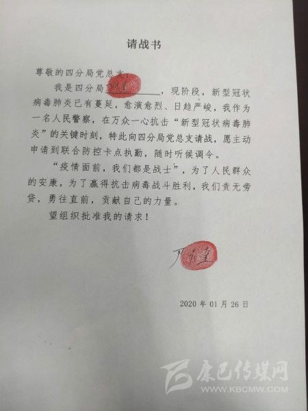 四川新聞網(wǎng)成都1月31日訊(記者 文驥 攝影報(bào)道) “疫情面前,我們都是戰(zhàn)士,為了人民群眾的安康,為了贏得抗擊病毒戰(zhàn)斗勝利,我們責(zé)無旁貸……”尹彥奎是成都交警四分局的一名黨員交警,1月26日,他向分局黨總支遞交了一份請(qǐng)戰(zhàn)書,還按上了手印。