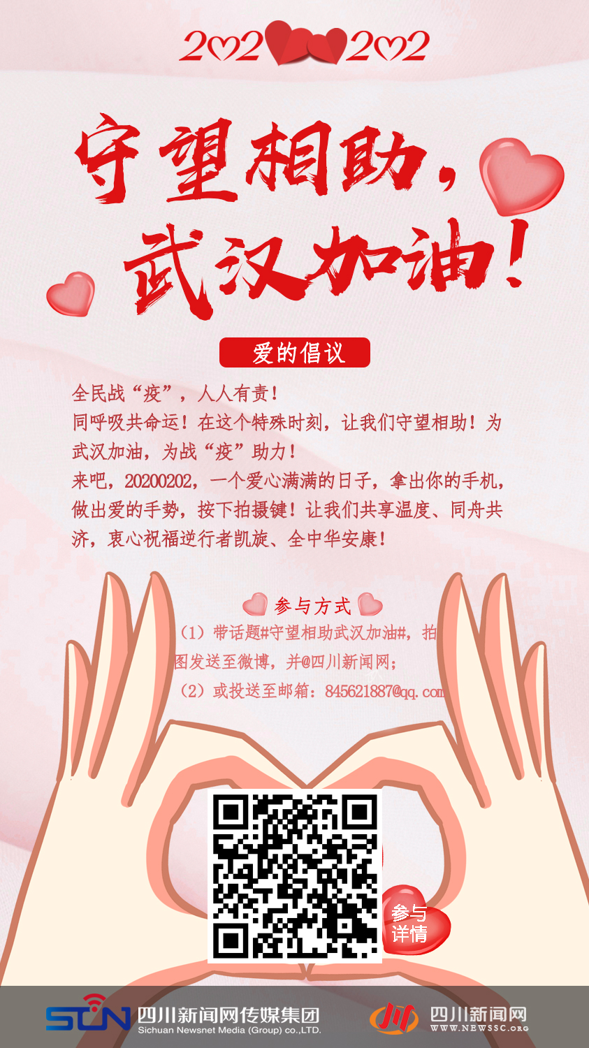四川新聞網成都2月2日訊(蔡曉慧)2020年2月2日,被網友們賦予了“愛你愛你”的特殊含義。這些日子以來,因為新型冠狀病毒感染的肺炎疫情,武漢“封城”全力抗擊疫情,四面八方匯集的醫(yī)護為這座城市帶去了力量和溫度,全國各地捐獻的物資為這座城市送去了支撐和關愛。在這個特殊的日子里,我們還可以做些什么,來為武漢加油?