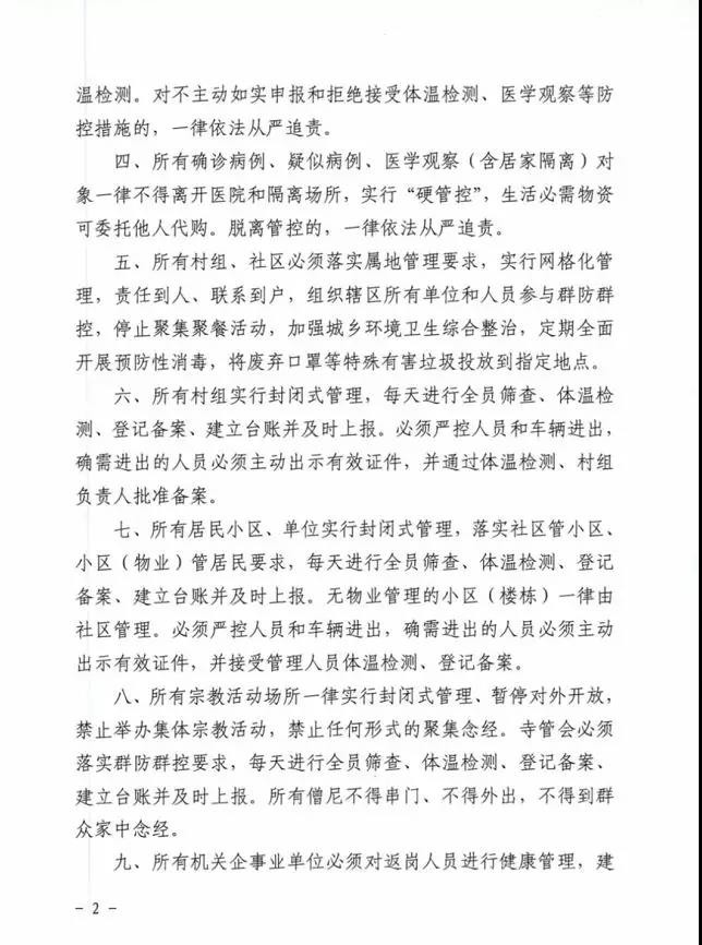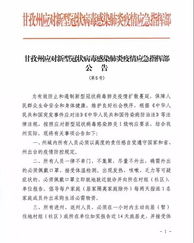 一、州域內所有人員必須以高度的責任感自覺遵守國家和省、州出臺的疫情防控規(guī)定。二、所有人員一律不串門、不集聚,盡量不外出,確需外出的必須佩戴口罩、接受體溫檢測。出現(xiàn)發(fā)熱、咳嗽、乏力等可疑癥狀的,必須佩戴口罩立即就地就近就診并向所在村組(社區(qū))、單位報告。倡導每戶家庭(居家隔離家庭除外)每兩天指派1名家庭成員外出采購生活必需物資。三、所有進州、返州人員,必須在一小時內主動向居(暫)住地村組(社區(qū))或所在單位如實報告近14天旅居史,并接受體溫檢測。對不主動如實申報和拒絕接受體溫檢測、醫(yī)學觀察等防控措施的,一律依法從嚴追責。四、所有確診病例、疑似病例、醫(yī)學觀察(含居家隔離)對象一律不得離開醫(yī)院和隔離場所,實行“硬管控”,生活必需物資可委托他人代購。脫離管控的,一律依法從嚴追責。五、所有村組、社區(qū)必須落實屬地管理要求,實行網(wǎng)格化管理,責任到人、聯(lián)系到戶,組織轄區(qū)所有單位和人員參與群防群控,停止聚集聚餐活動,加強城鄉(xiāng)環(huán)境衛(wèi)生綜合整治,定期全面開展預防性消毒,將廢棄口罩等特殊有害垃圾投放到指定地點。六、所有村組實行封閉式管理,每天進行全員篩查、體溫檢測、登記備案、建立臺賬并及時上報。必須嚴控人員和車輛進出,確需進出的人員必須主動出示有效證件,并通過體溫檢測、村組負責人批準備案。七、所有居民小區(qū)、單位實行封閉式管理,落實社區(qū)管小區(qū)、小區(qū)(物業(yè))管居民要求,每天進行全員篩查、體溫檢測、登記備案、建立臺賬并及時上報。無物業(yè)管理的小區(qū)(樓棟)一律由社區(qū)管理。必須嚴控人員和車輛進出,確需進出的人員必須主動出示有效證件,并接受管理人員體溫檢測、登記備案。八、所有宗教活動場所一律實行封閉式管理、暫停對外開放,禁止舉辦集體宗教活動,禁止任何形式的聚集念經。寺管會必須落實群防群控要求,每天進行全員篩查、體溫檢測、登記備案、建立臺賬并及時上報。所有僧尼不得串門、不得外出,不得到群眾家中念經。九、所有機關企事業(yè)單位必須對返崗人員進行健康管理,建立管理臺賬,并向所在社區(qū)(村組)報備,對確認無可疑癥狀的準予返崗工作。單位食堂必須規(guī)范管理,實行分散就餐。十、非居民生活必需的公共場所一律關閉,經批準營業(yè)的公共場所中央空調一律關停。商場、超市、賓館、飯店、農貿市場、公共客運、個體商戶等市場經營主體必須嚴格落實疫情防控措施,每天開展預防性消毒工作,從業(yè)和進入人員一律佩戴口罩、檢測體溫、備案登記。藥店、診所、村衛(wèi)生室出售退燒、咳嗽類藥品必須實名制登記,并每日上報轄區(qū)疾控部門,對近14天有重點疫區(qū)旅居史的立即上報??爝f、外賣實行無接觸配送。十一、車站、機場和交通檢疫站點實行進出人員全覆蓋體溫檢測和登記備案制度,對體溫異常人員立即采取就地就近隔離觀察。對拒絕配合的,公安機關依法協(xié)助強制執(zhí)行;對妨害執(zhí)行公務的,公安機關依法從嚴從重處理。十二、廣大黨員、干部、各級人大代表、政協(xié)委員要發(fā)揮帶頭作用,嚴格管好家人和親屬,積極主動參與疫情防控工作,帶動街坊鄰居自覺遵守相關規(guī)定。 本公告自發(fā)布之日起實施,終止日期另行公告。 甘孜州應對新型冠狀病毒感染肺炎疫情應急指揮部