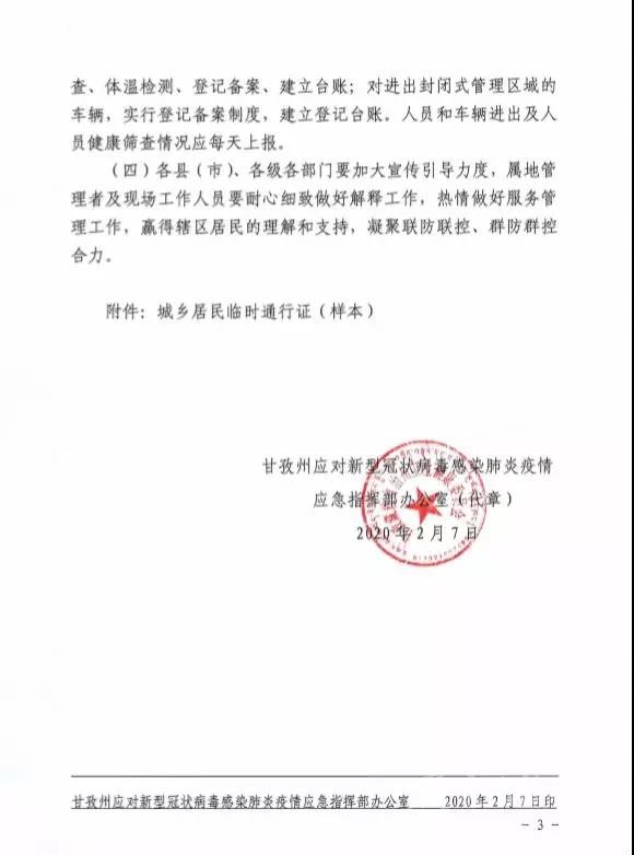 今(7)日,甘孜州應(yīng)對新型冠狀病毒感染肺炎疫情應(yīng)急指揮部發(fā)布通知,規(guī)定即日起對州域內(nèi)所有人員和車輛出入封閉式管理區(qū)域?qū)嵭信R時管制,均憑證通行,并公布了通行證制作發(fā)放方式。通知全文如下: