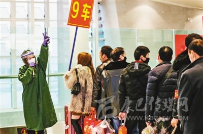為在疫情期間幫助外出務(wù)工人員安全、順利返崗就業(yè),宜賓市先后采用專列、包車、包機(jī)等多種方式免費(fèi)運(yùn)送務(wù)工人員前往省內(nèi)外各地市。圖為當(dāng)日宜賓西站客運(yùn)員引導(dǎo)外出務(wù)工人員有序登車。