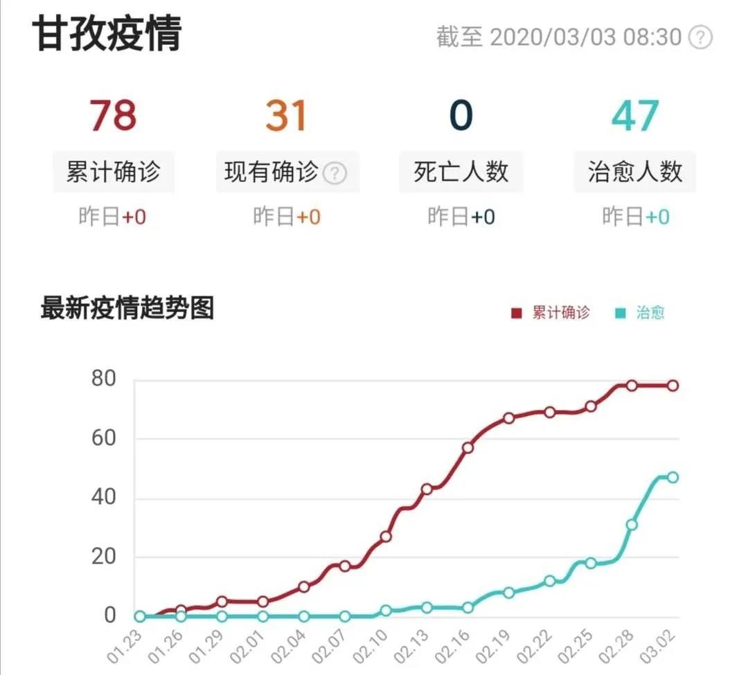 截至3月2日24時,我州累計報告確診病例78例,累計治愈出院47人(道孚縣42人、康定市2人、色達縣2人、稻城縣1人),其余31人均在定點醫(yī)院隔離治療,203名密切接觸者正在接受醫(yī)學(xué)觀察。我州道孚縣連續(xù)4天無確診病例報告,其余17個縣(市)連續(xù)28天無確診病例