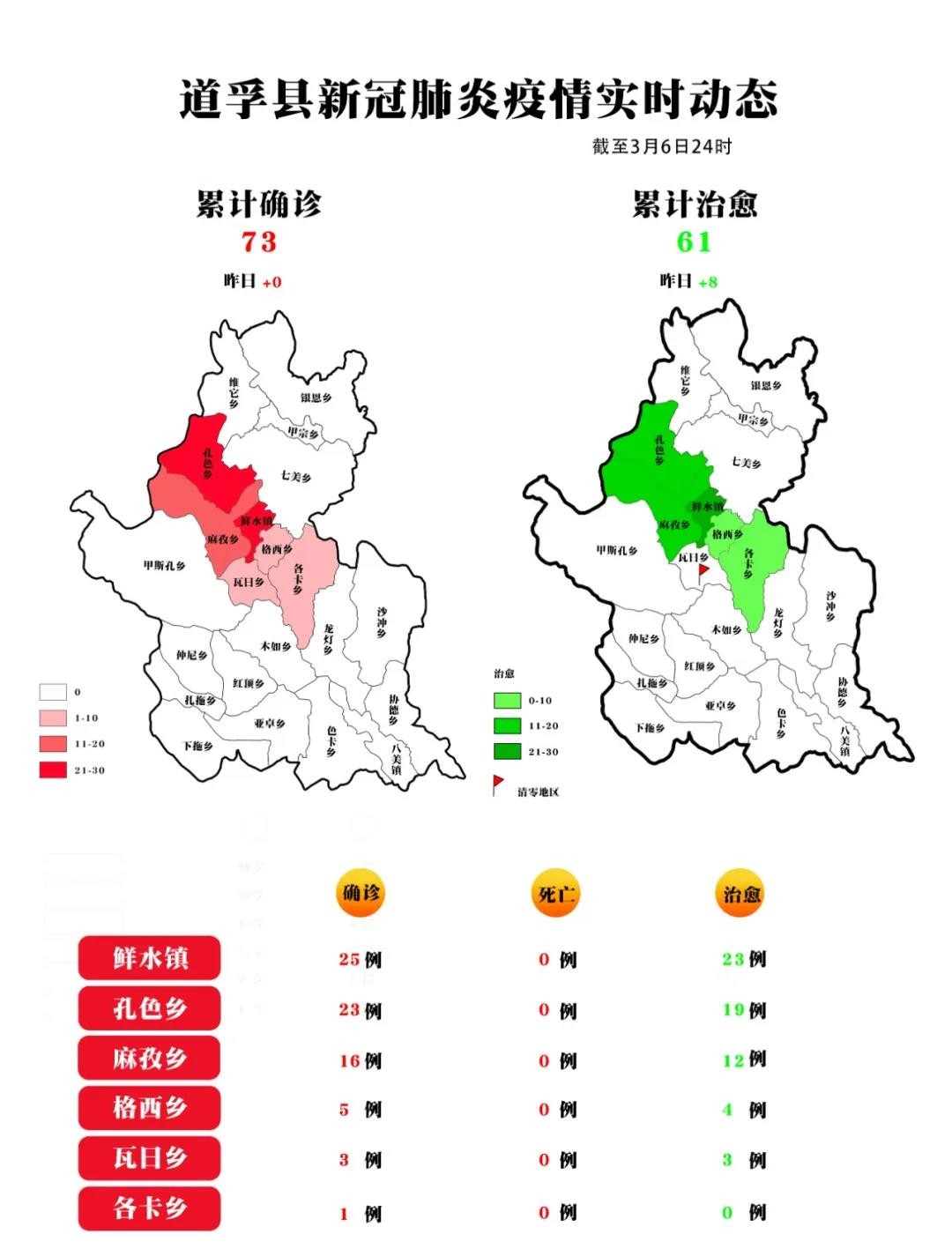 各縣(市)確診病例情況表 疫情實(shí)時(shí)追蹤 (截至2020年3月6日24時(shí))縣(市) 累計(jì)病例 新增病例 道孚縣 73 0 康定市 2 0 色達(dá)縣 2 0 稻城縣 1